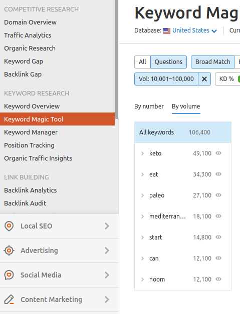 Semrush is one tool where you can search for “head terms” and get all the possible stats related to it. A search for “diet” reveals this: